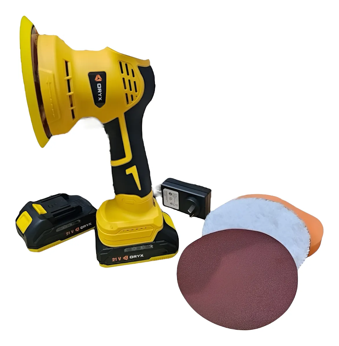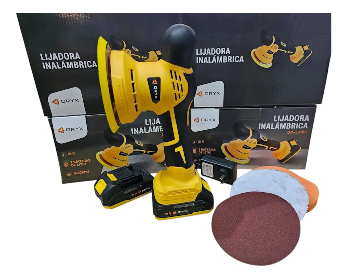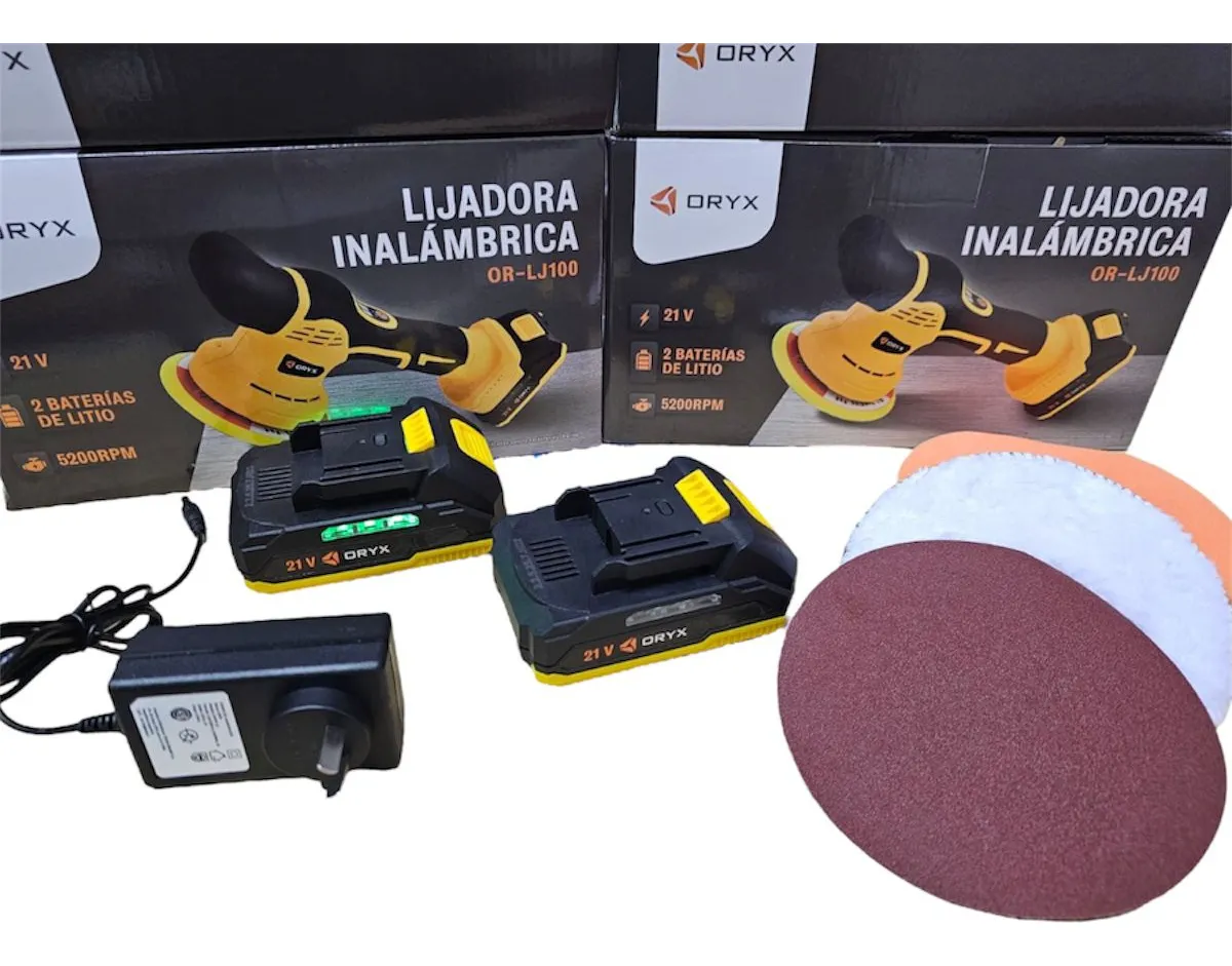 Lijadora, 2 baterías, cargador, discos de lija, pulido y lustro.